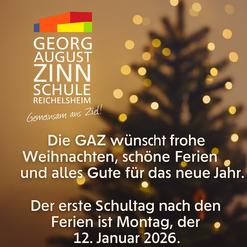 Die Schulgemeinde der Georg-August-Zinn-Schule Reichelsheim wünscht allen Lehrkräften, Lernenden, Eltern und Mitarbeitenden ein frohes Weihnachtsfest, schöne Ferien und alles Gute für das neue Jahr 2026. Der erste Schultag nach den Ferien ist Montag, der 12. Januar 2026. Aktuelle Informationen gibt es auch auf unseren Social-Media-Kanälen bei Instagram und Facebook.