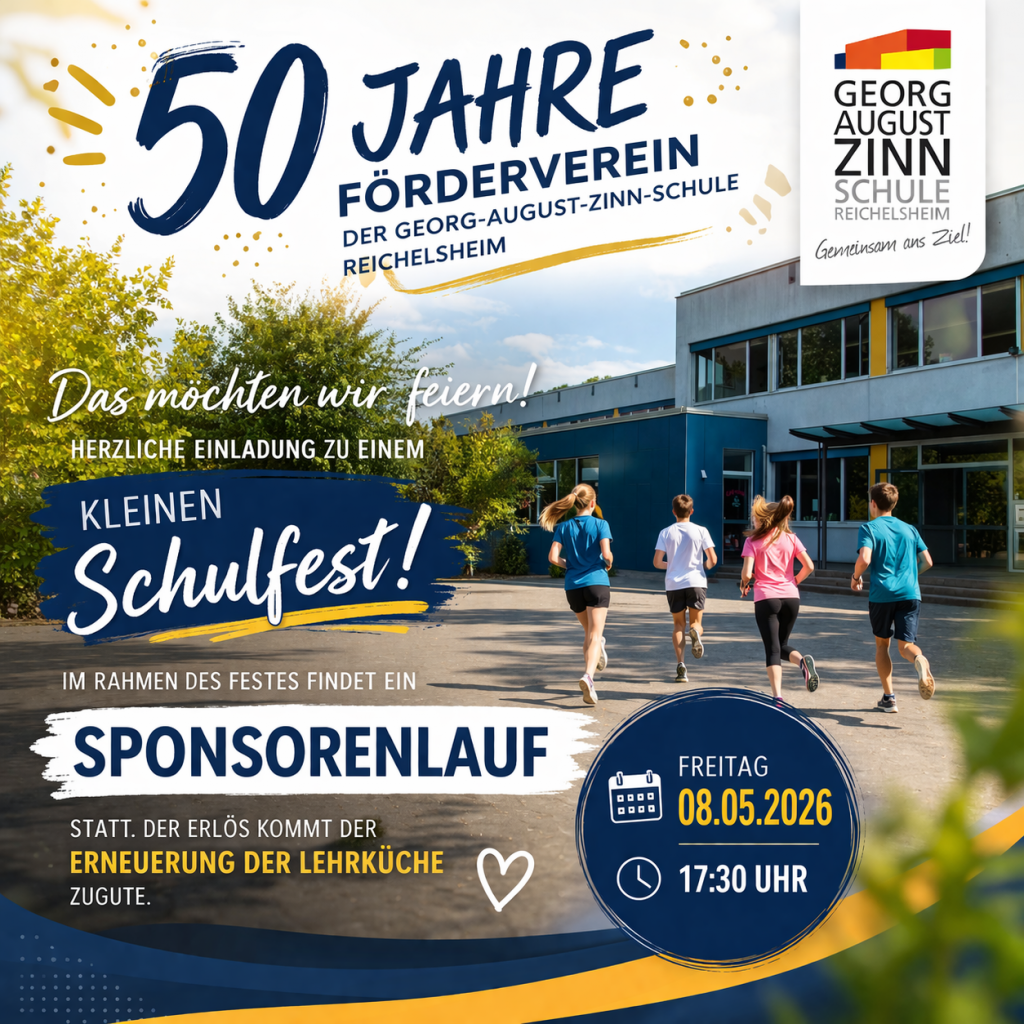 Der Förderverein der Georg-August-Zinn-Schule Reichelsheim wird 50 Jahre alt und das soll gefeiert werden! Deshalb laden wir ein zu einem kleinen Schulfest am Freitag, den 08.05.2026 um 17.30 Uhr, in dessen Rahmen ein Sponsorenlauf stattfinden wird. Der Erlös kommt der Renovierung der Lehrküche und weiteren Projekten zugute.