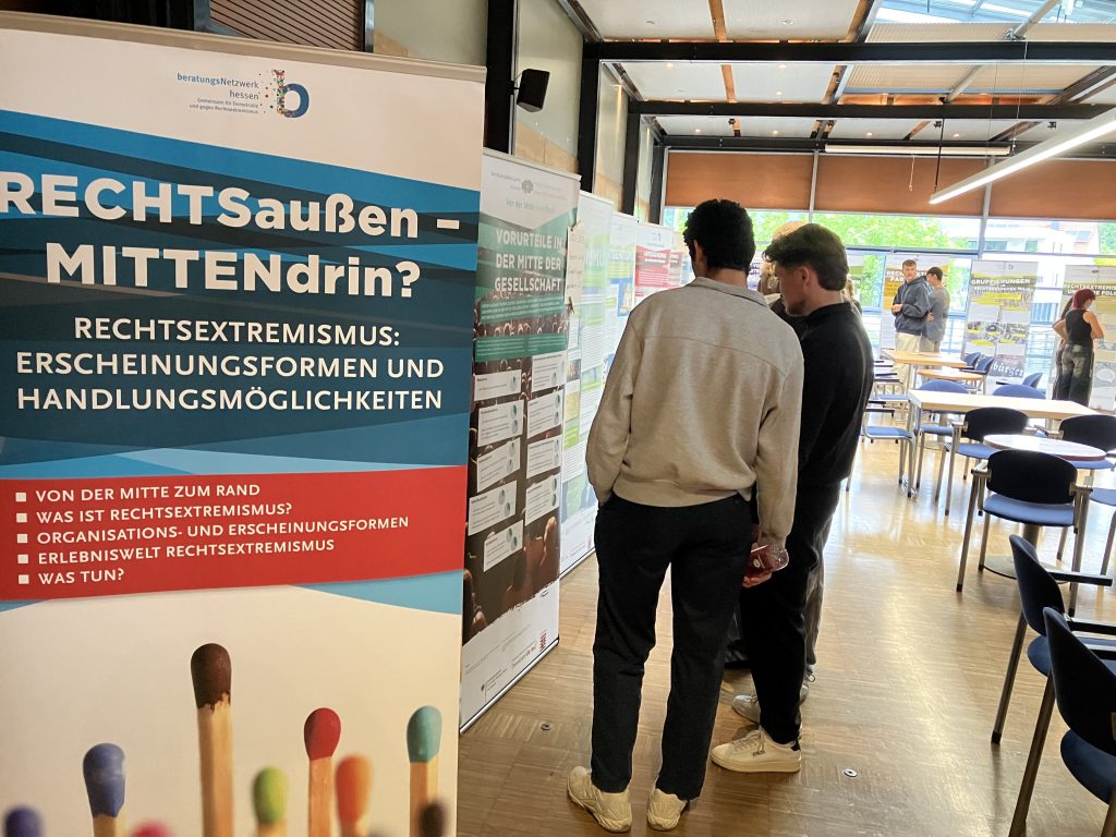 In der ersten Septemberwoche besuchten die Schülerinnen und Schüler der GAZ eine Ausstellung zum Thema Rechtsextremismus in der Reichenberghalle. Die Ausstellung trug den Titel "Rechtsaußen – Mittendrin?" und wurde von der Gemeinde Reichelsheim, der Diakonie Odenwald, dem Generationennetz Reichelsheim und der Ortsgruppe der "Omas gegen Rechts" organisiert. Unter den Besuchern der Ausstellung war auch die Klasse 10e mit ihrer Fachlehrkraft Mariette Köster.