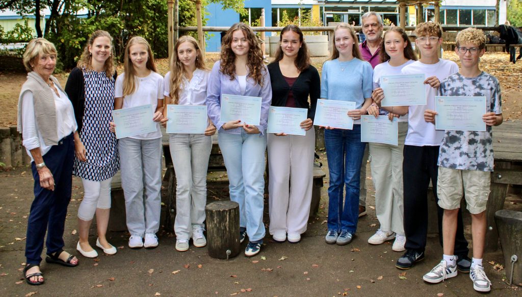 Am 5. September 2025 war es endlich soweit: Die diesjährigen Teilnehmenden der DELF-Prüfung (diplome d’études en langue française) konnten auf dem Schulhof der GAZ ihre Diplome in Empfang nehmen. Bereits im März hatten sich neun Lernende der Klassenstufen 7 bis 10 den Prüfungen gestellt. Diese bestanden aus einem schriftlichen Teil an der GAZ sowie einer mündlichen Prüfung am Institut français in Mainz. Ein großer Dank geht an den deutsch-französischen Verschwisterungsvereins von Reichelsheim.