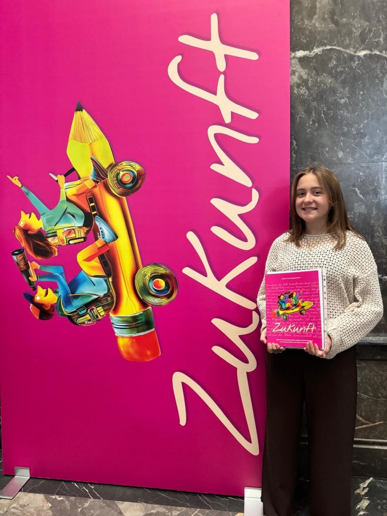 Großer Erfolg für die Georg-August-Zinn-Schule: Die Schülerin Mayla Huber (Klasse 7f) wurde beim hessenweiten Wettbewerb zum "Tag der Handschrift" ausgezeichnet. Mit ihrem handgeschriebenen Brief zum Thema "Zukunft" überzeugte sie die Jury durch inhaltliche Tiefe und eine besonders ausdrucksstarke Handschrift.