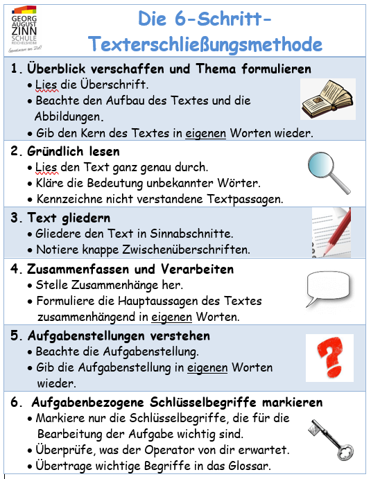 - Die Sechs-Schritt-Texterschließungsmethode wird in allen Fächern regelmäßig angewendet. Diese Methode kann sowohl für die Texterschließung von literarischen Texten als auch von Sachtexten angewendet werden.