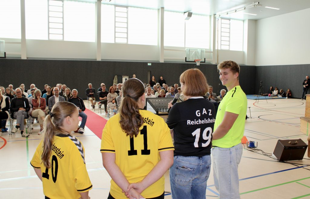 Mehrere Jahre hieß es für die Schülerinnen und Schüler der Georg-August-Zinn-Schule Reichelsheim (GAZ) „Sportunterricht in der Reichenberghalle“ oder „draußen im Stadion“. Schließlich prägte eine Großbaustelle bis Mitte des Jahres den Bereich zwischen Neubau und Schulschwimmbad. Dank eines Millionen-Zuschusses aus dem Kommunalen Investitionsprogramm II und einer nicht unerheblichen Restfinanzierung durch den Odenwaldkreis als Schulträger konnte die in die Jahre gekommene Halle nunmehr komplett neu saniert werden. Weil Material nicht geliefert werden konnte und sich Maßnahmen verteuerten, war Geduld das Gebot der Stunde. Wie Lernende und Lehrkräfte bei der feierlichen Einweihung am 24.09.2024 aber übereinstimmend beteuerten, habe sich das Warten definitiv gelohnt. Schließlich konnte mit der Fertigstellung der Dreifelder-Halle auch der lange Wunsch nach einer weiteren Umkleidekabine und eines Sport-Theorieraums realisiert werden, der nicht nur beim nächsten Sportabitur an der Reichelsheimer Bildungseinrichtung genutzt werden wird. Darüber hinaus wurde die gesamte Haustechnik erneuert und eine feste Tribüne für bis zu 300 Besucherinnen und Besucher installiert.