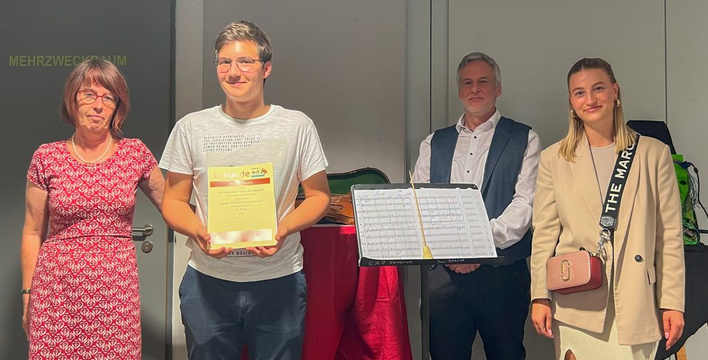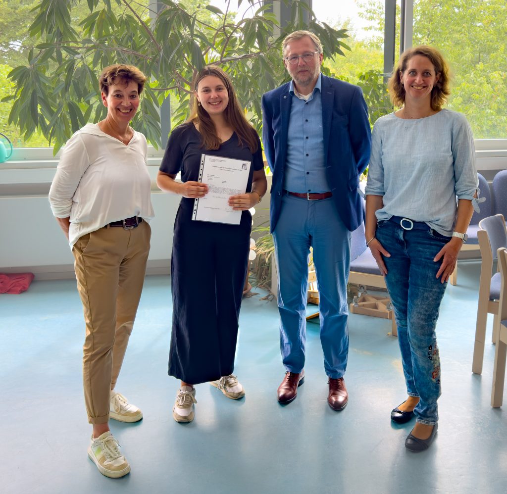 Paula Fleischer hat am 20. Juni 2024 ihr Zweites Staatsexamen bestanden. Gemeinsam mit ihr freuten sich im Anschluss an die Examensprüfungen von links: Oberstudienrätin Carina Fröhlich (Leiterin des Schulseminars an der GAZ), Studiendirektor Dr. Martin Schmidl (Lehrkraft des Vertrauens) sowie Studiendirektorin Tina Schäfer (Schulleitungsmitglied in der Prüfungskommission).