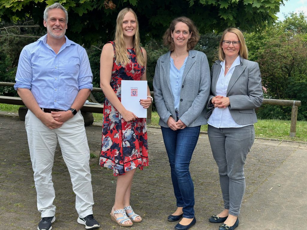 Esther Weil hat am 13. Juni 2024 erfolgreich ihre Anerkennungsprüfung an der Georg-August-Zinn-Schule Reichelsheim absolviert. Ihr in der USA erworbener Lehramtsabschluss wird nun auch in Hessen anerkannt. Die junge Pädagogin darf ab sofort die Fächer Mathematik und Englisch bis zum Abitur unterrichten.