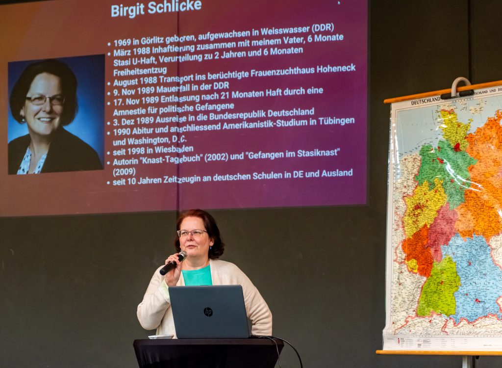 Am 4. Juni 2024 versammelten sich alle zehnten Klassen der Georg-August-Zinn-Schule in der Aula der Schule, um der DDR-Zeitzeugin Birgit Schlicke zuzuhören. Der Geschichtslehrer René Beck hatte sie eingeladen, um für die Schülerinnen und Schüler die Geschichte der DDR greifbar zu machen.