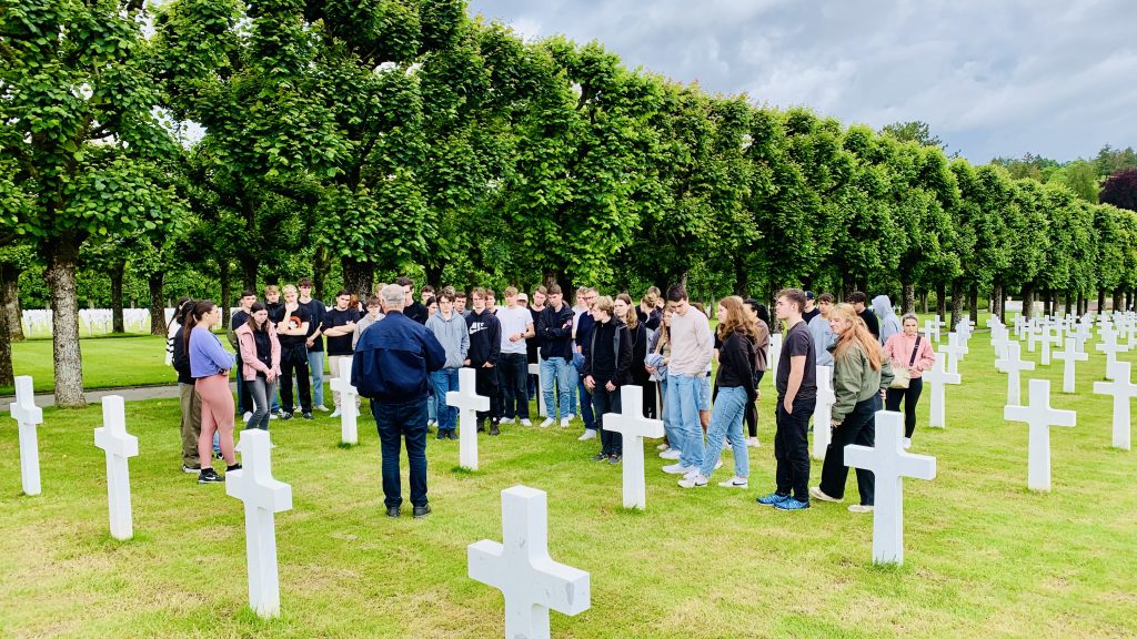 Am Eingang des „Beinhauses“ von Douaumont versammelten sich die über 50 Teilnehmenden der diesjährigen Verdun-Exkursion der zwölften Klassen der Georg-August-Zinn-Schule (GAZ). Unter dem Symbol „PAX“ (Friede) setzten die Reichelsheimer Schülerinnen und Schüler mit ihren Lehrkräften ein Zeichen für Frieden und Freundschaft zwischen Deutschland und Frankreich.