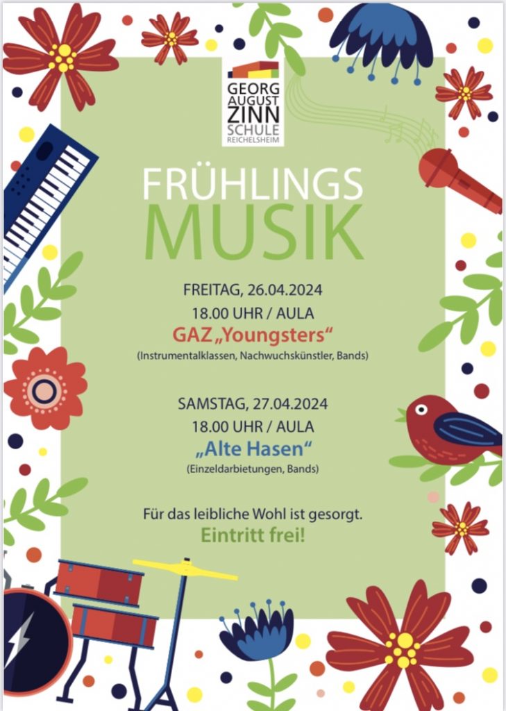 Kurz nach den Osterferien, am 26. und 27. April 2024, finden zwei Konzerte an der Georg-August-Zinn-Schule Reichelsheim (GAZ) statt. Beginn ist jeweils um 18.00 Uhr.