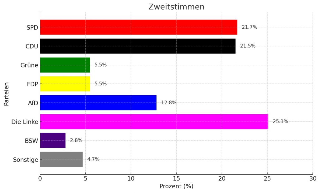 Als stärkste Kraft schnitt dabei DIE LINKE ab, die 25,1 Prozent der Zweitstimmen erreichte. Den zweiten Platz belegte die SPD mit 21,7 Prozent, dicht gefolgt von der CDU, die 21,5 Prozent der abgegebenen Stimmen auf sich vereinen konnte. Es folgen die AfD mit 12,8, Bündnis 90 / Die Grünen und FDP mit jeweils 5,5 und das BSW mit 2,8 Prozent.