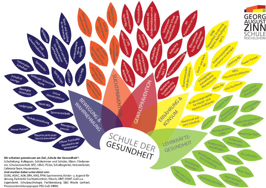 Die Georg-August- Zinn Schule besitzt eine bunte Gesundheitsblume, deren Blütenblätter für die vielfältigen Aktionen, Projekte und Angebote in den verschiedenen Bereichen der Gesundheitsförderung stehen. Jedes Blütenblatt repräsentiert eine Maßnahme zur Förderung von Gesundheit und Wohlbefinden